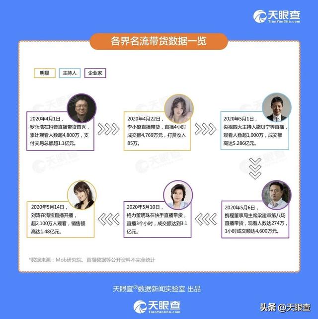 据天眼查信息显示,我国上半年成立了超9千家直播相关企业,与去年同期相比增长409%。随直播电商的不断发展,除了普通主播外,各大商业大佬、明星等也参与到直播当中。已有100名CEO来到淘宝直播间,其中不乏罗永浩、董明珠,还有央视的主持人康辉、撒贝宁等。